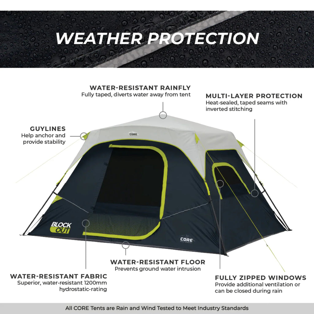 WEATHER PROTECTION: H20 Block Technology combines water-repellent fabrics with a fully taped rainfly and sealed seams to resist rain.