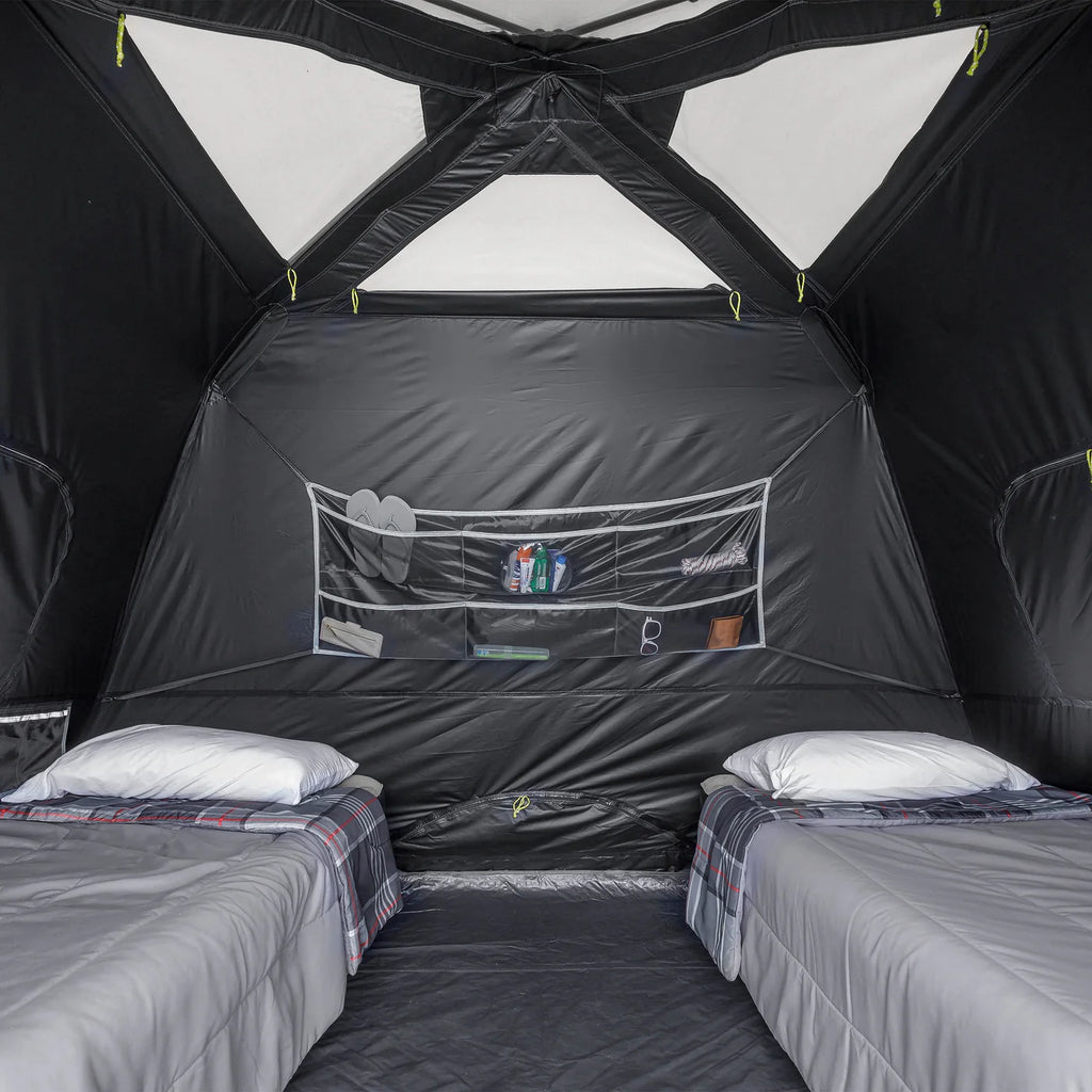WHAT’S IN THE BAG: Includes tent with pre-attached poles, rainfly with attached guylines, wall organizer, tent stakes, and carry bag.