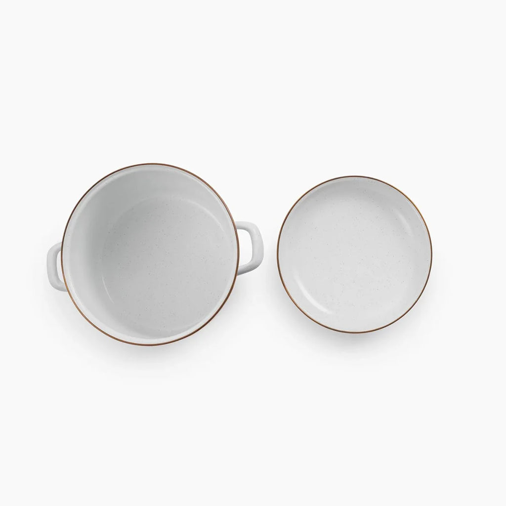 The Barebones Enamel Stock Pot in Eggshell is a functional and elegant piece of cookware, perfect for use in both indoor kitchens and outdoor cooking settings. This stock pot boasts a vintage-inspired design, featuring a creamy white Eggshell color with a speckled enamel finish. Its aesthetic is enhanced by a hand-finished, baked stainless steel rim that develops a bronze-like patina, adding a rustic charm to your cooking setup. Whether you’re simmering soups at home or preparing meals over a campfire, this pot combines functionality with timeless style.​