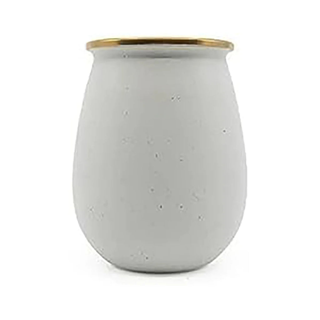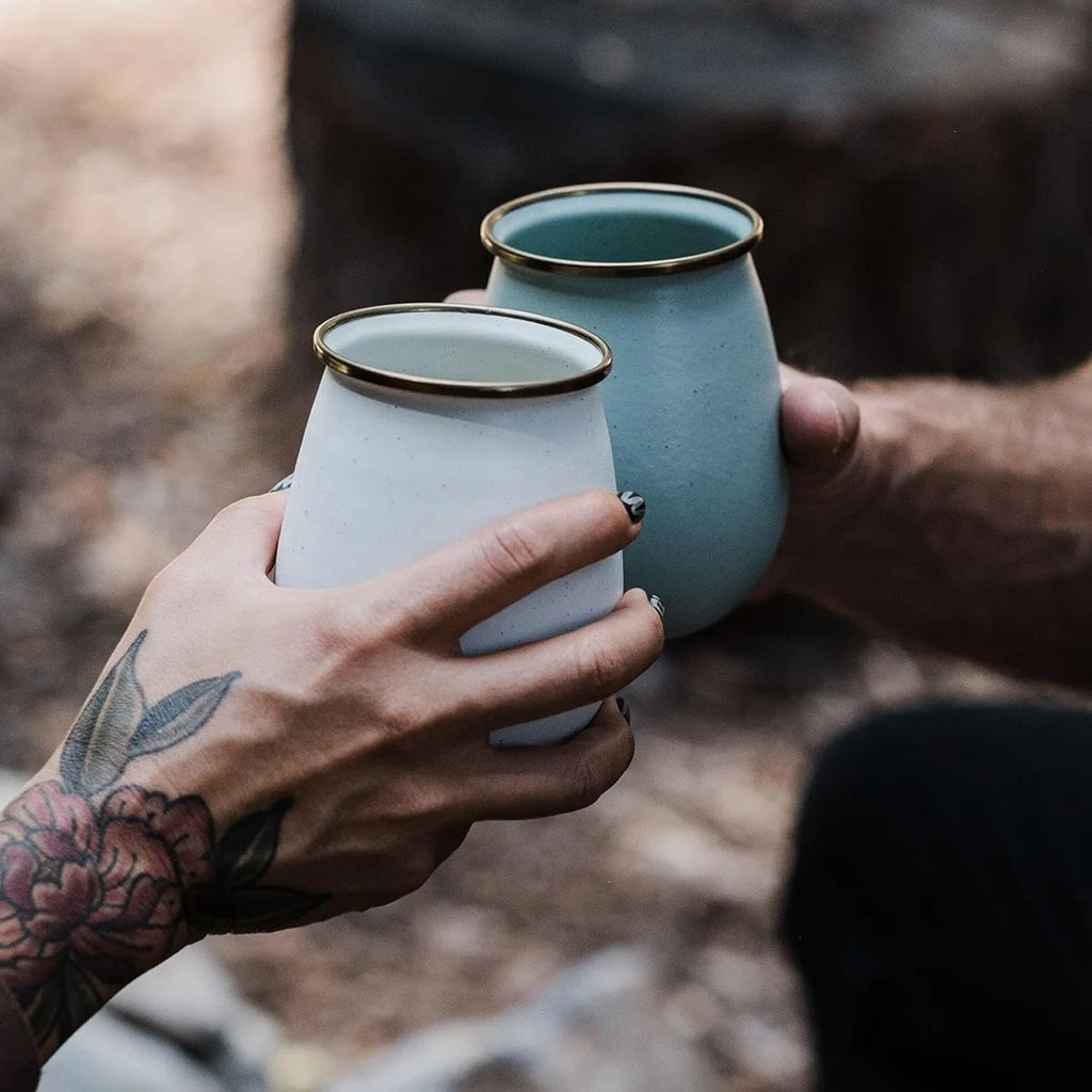 Crafted from enameled steel, each tumbler features a creamy white eggshell hue with a speckled finish. The baked stainless steel rim is hand-finished and gradually forms a bronze-like patina, giving each piece its own distinct character. These tumblers are ideal for enjoying hot or cold beverages, whether you’re at home or around a campfire.​