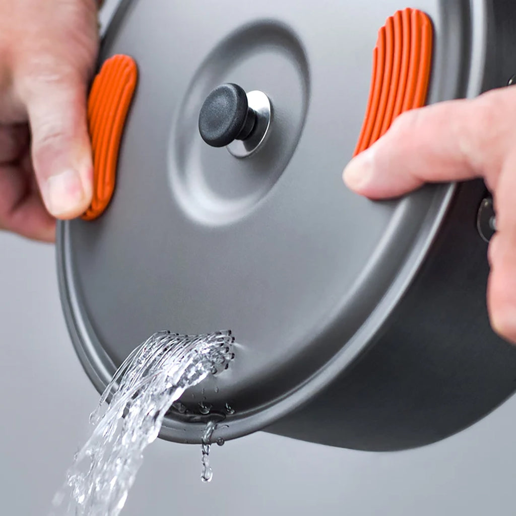 Made from Halulite hard-anodized aluminum, this 2-liter pot offers superior conductivity to titanium while remaining exceptionally lightweight. It cooks more efficiently, allowing you to travel farther with less fuel. The integrated silicone thumb pads on the lid ensure safe and secure pasta straining.