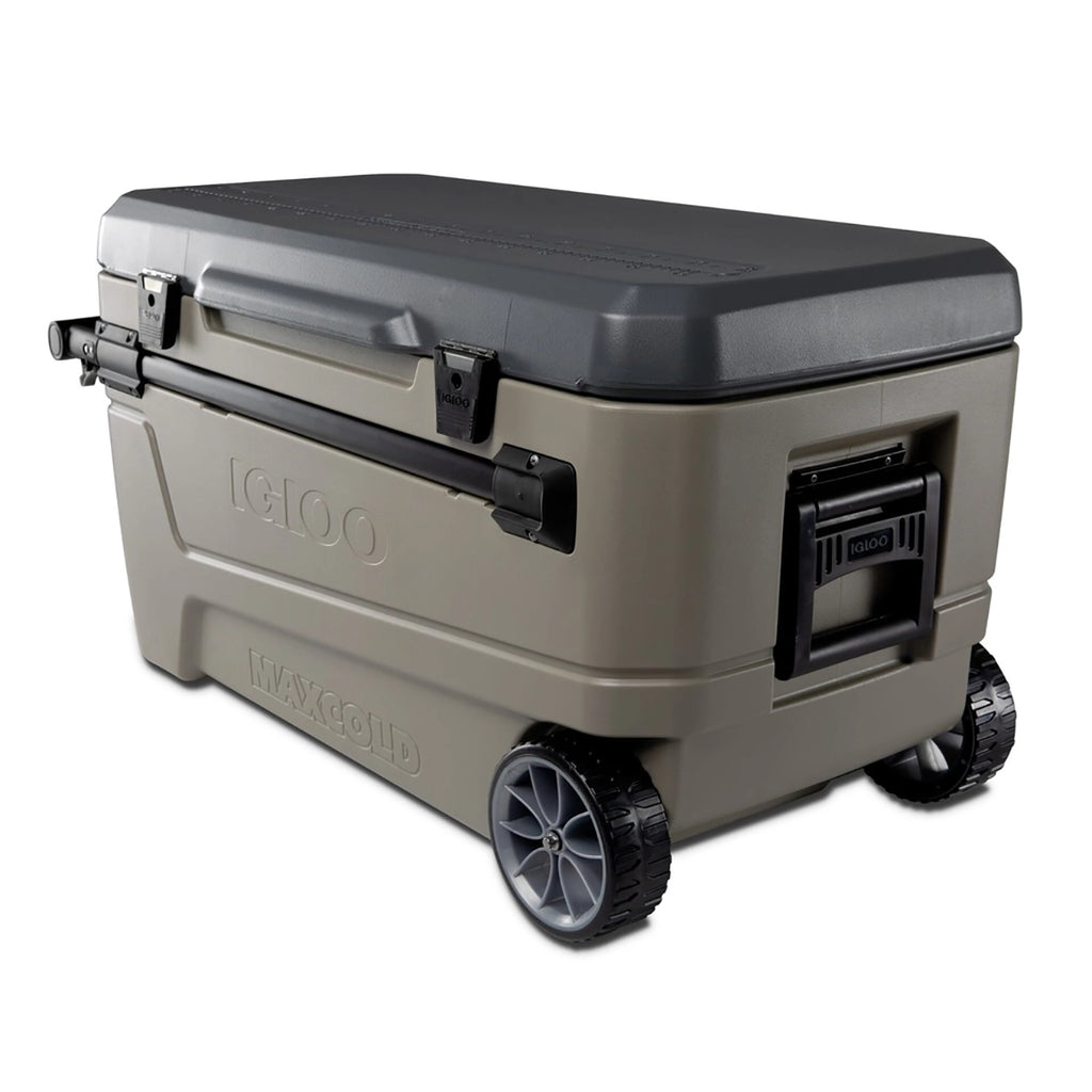The IGLOO Sportsman Sunset Glide 110 Qt Cooler in Sandstone/Carbonite is a robust and spacious cooler designed for outdoor enthusiasts who require reliable performance and ease of transport. With its large capacity and advanced insulation, it’s ideal for camping trips, fishing expeditions, tailgating, and extended outdoor events.​ This 110-quart cooler combines durability with user-friendly features. Its MaxCold® Technology ensures contents stay cold for up to five days, while the horizontal telescoping handle and soft-ride wheels make transportation effortless, even when fully loaded.​