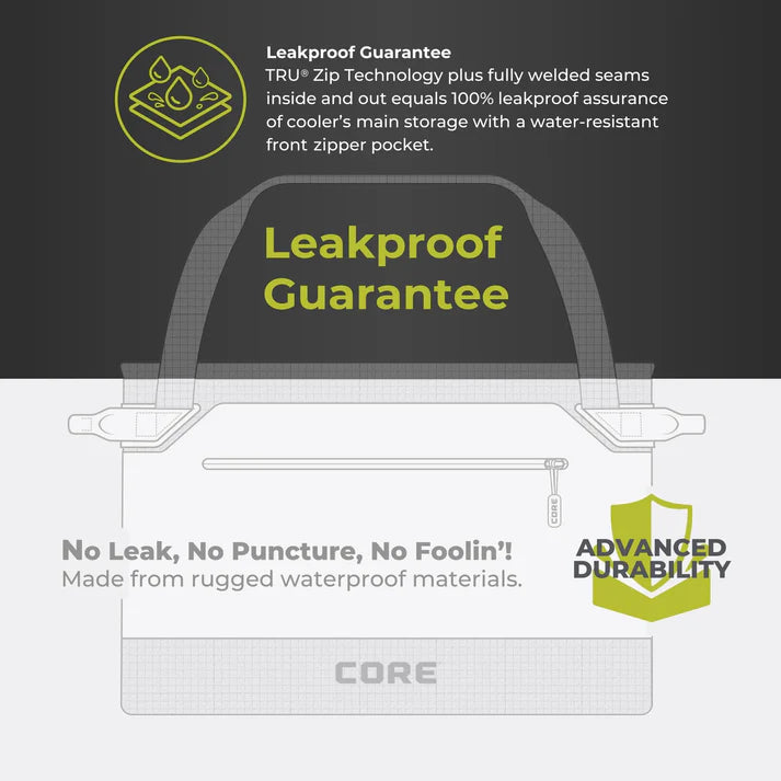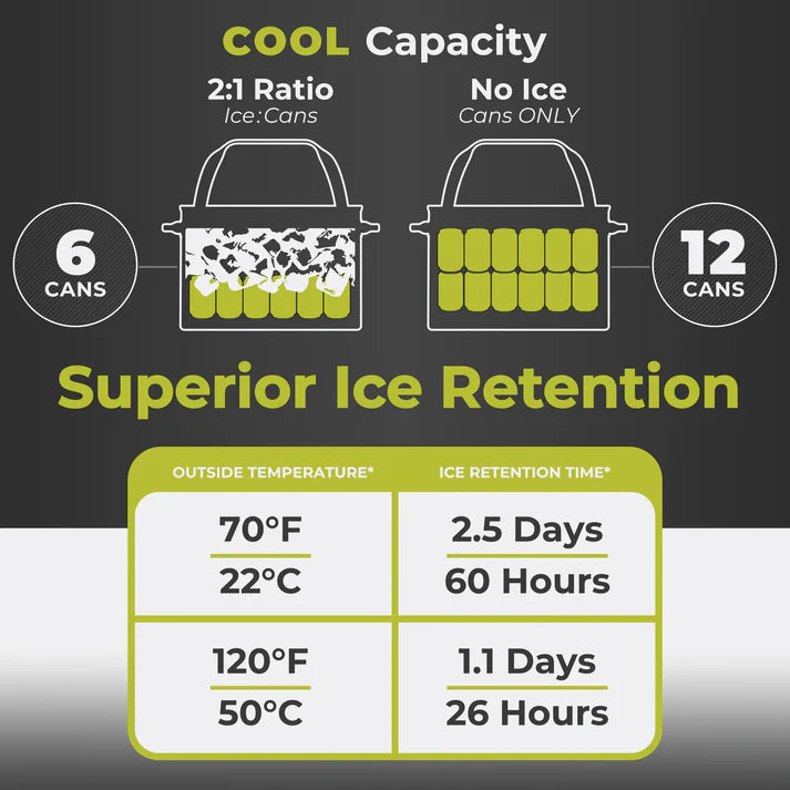 SUPERIOR ICE RETENTION: CORE COOL™ Insulation keeps contents chilled up to 2.5 days, using high-density EVA foam to retain cold, combined with reflective mylar film to repel heat.