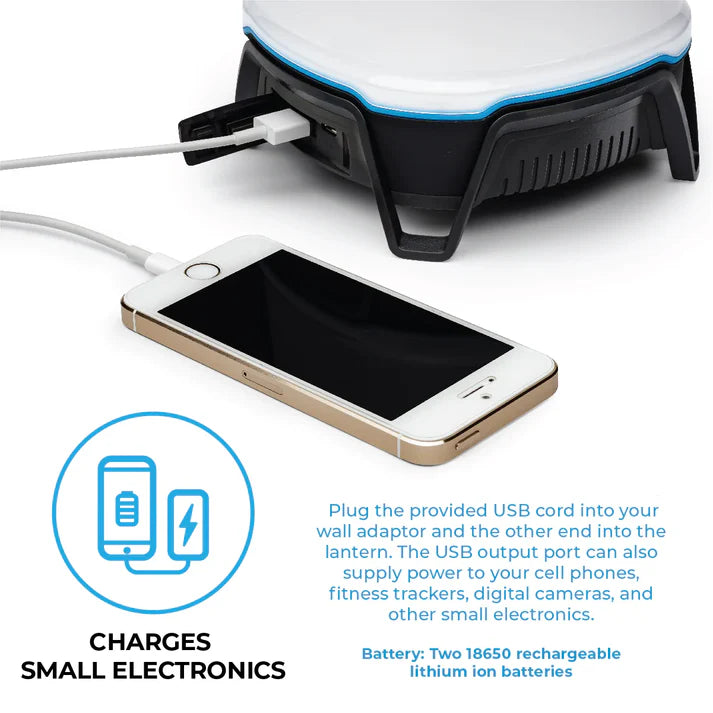 CHARGES SMALL ELECTRONICS: Plug the provided USB into your wall adaptor and the other end into the lantern. A solid green light will indicate a full charge. The USB output port can supply power to your cell phones, fitness trackers, digital cameras, and other small electronics.