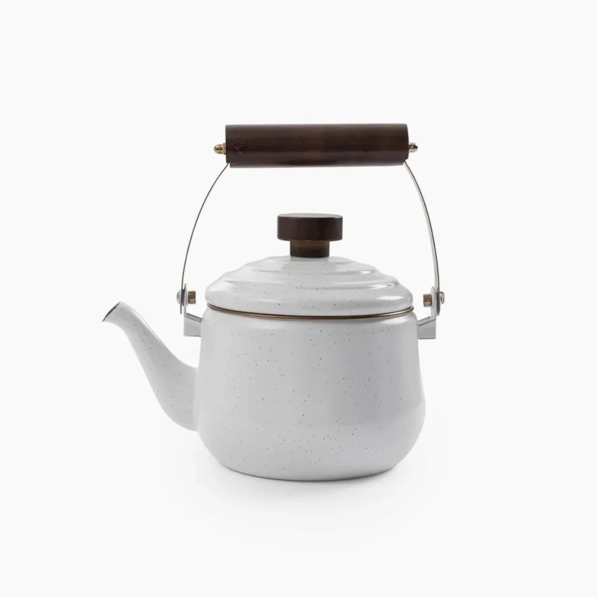 This teapot showcases a creamy white Eggshell tone with a speckled enamel finish, accented by a hand-finished baked stainless steel rim that naturally develops a bronze-like patina over time. The FSC-certified natural walnut handle adds a touch of rustic elegance, ensuring a comfortable grip while pouring. Its design is both stylish and practical, suitable for heating water for tea, coffee, or hot chocolate, whether at home or around a campfire.