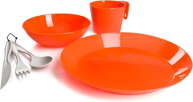 It includes a 9.5-inch plate, a 6-inch bowl, a 12-ounce mug, and a full-sized fork, knife, and spoon. Made from durable, flexible, and 100% recyclable polypropylene, the Cascadian mess kit is an eco-friendly alternative to disposable dinnerware. The sturdy, wide-handled cutlery is designed for a secure grip, even with gloves.