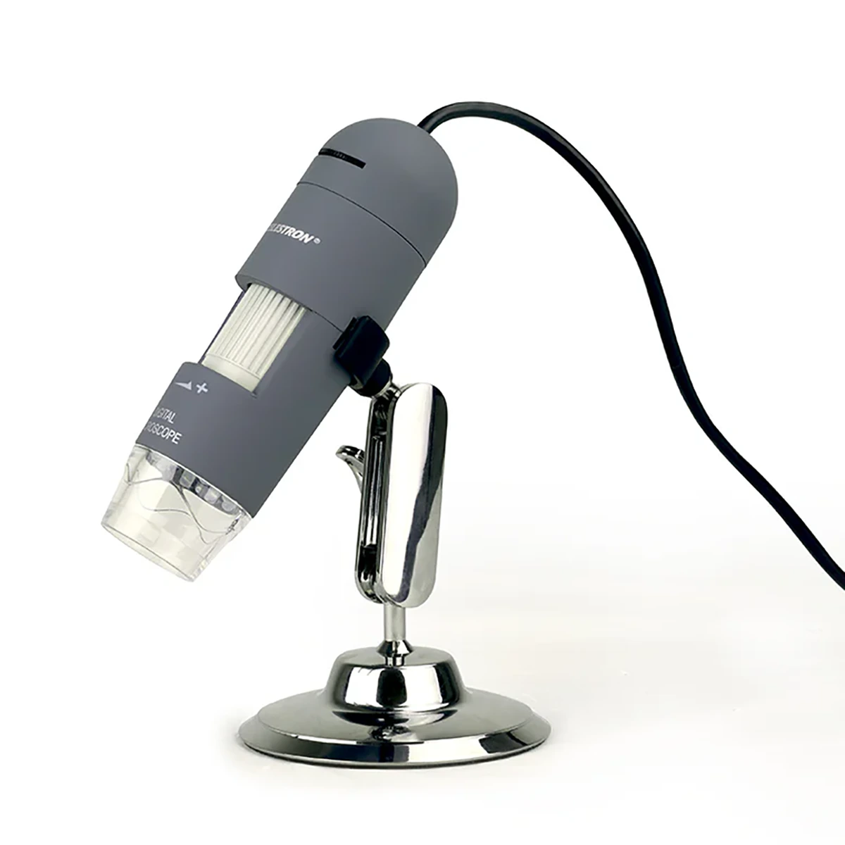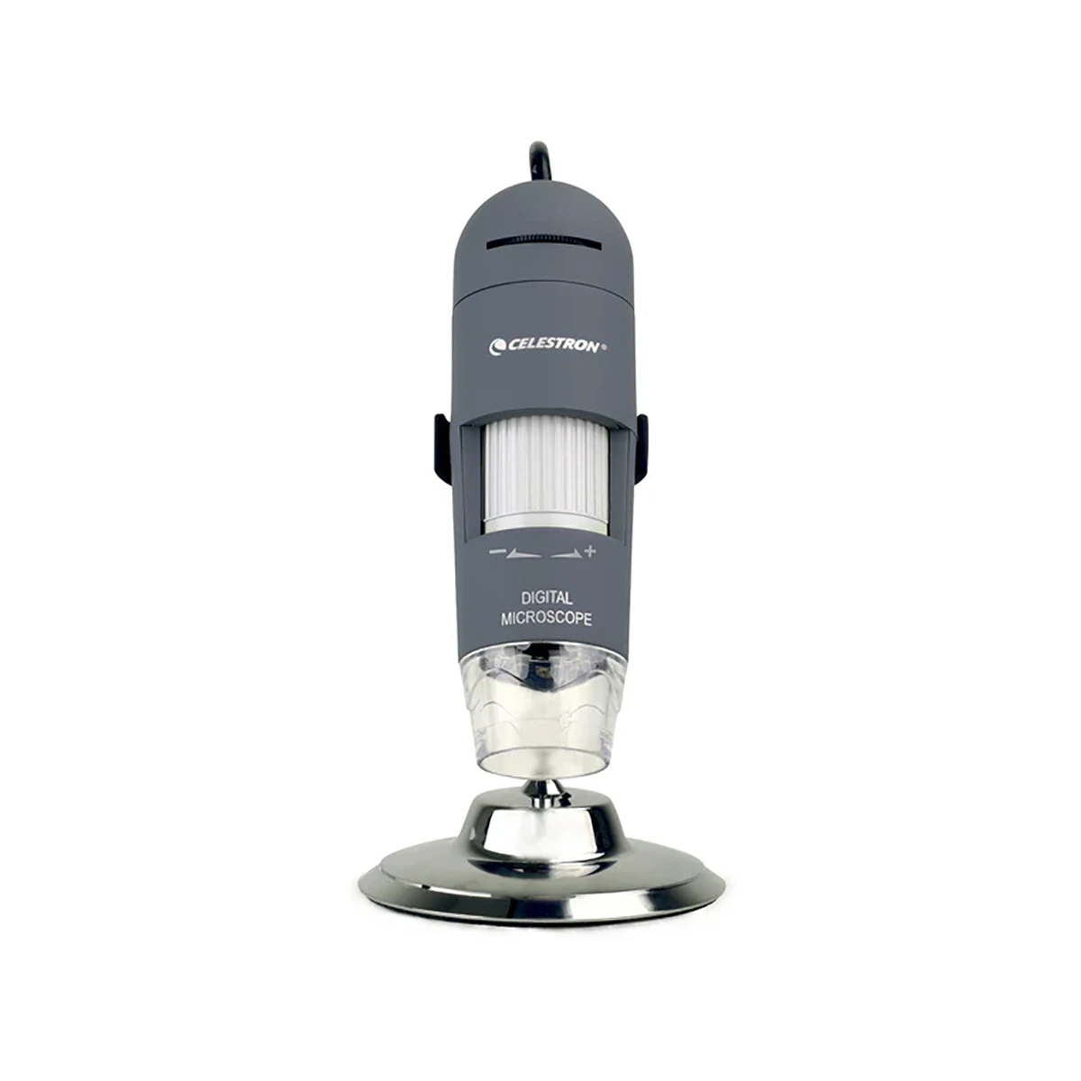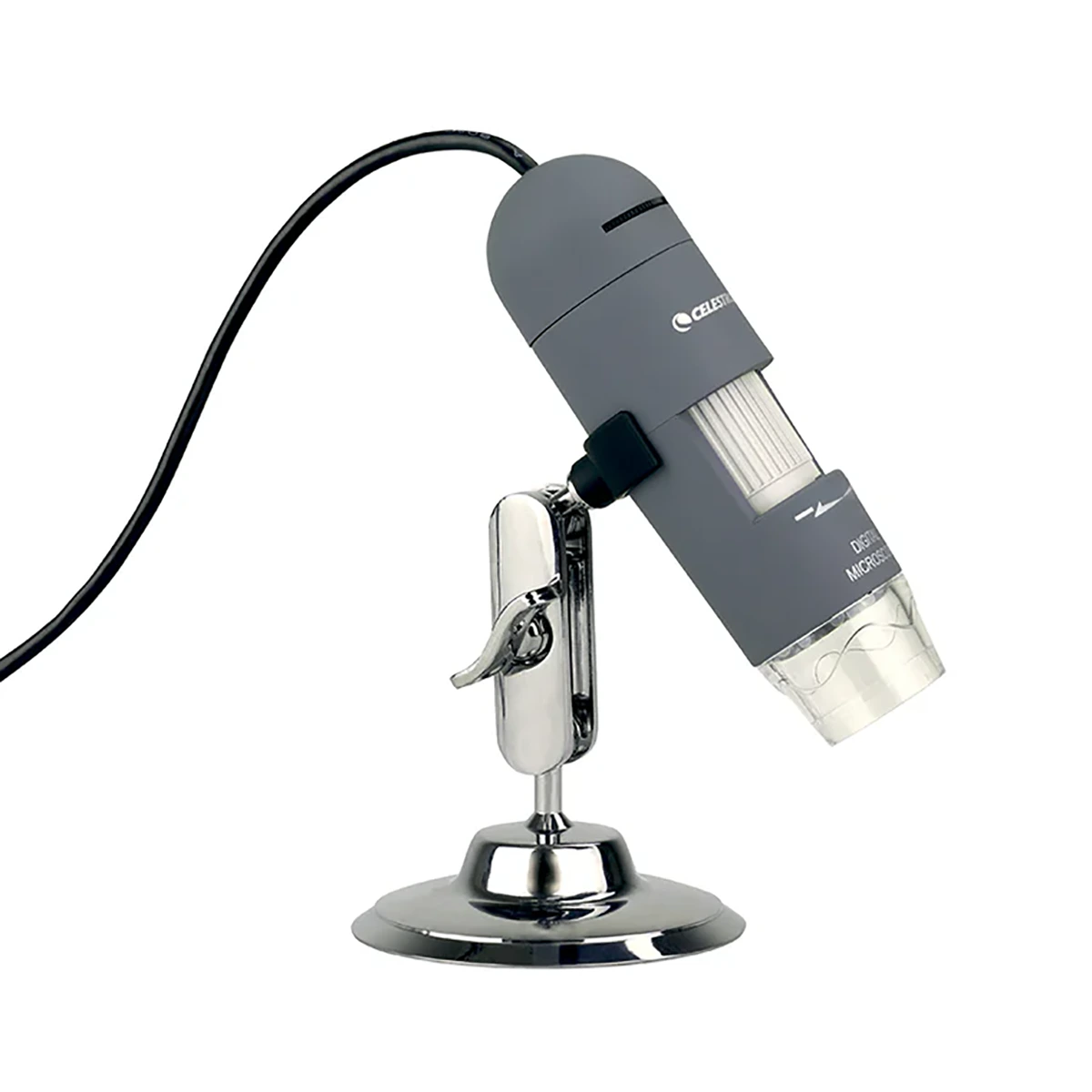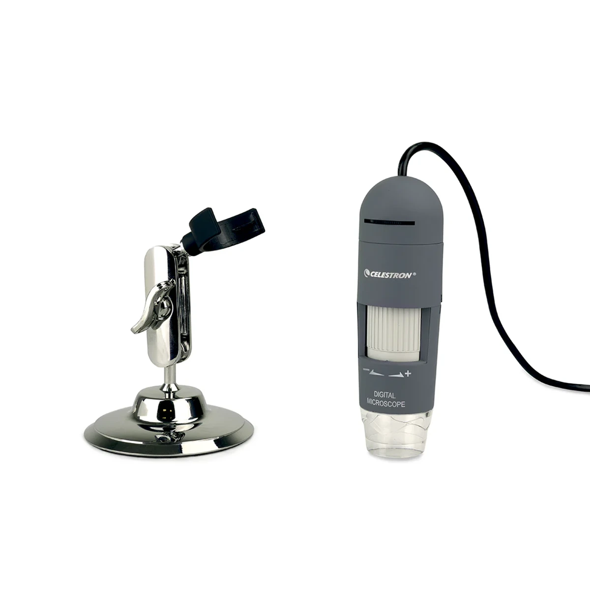 The Celestron Deluxe Handheld Digital Microscope (Model 44302-C) is a versatile, USB-powered device designed for hobbyists, educators, and professionals. Its compact and ergonomic design allows for both handheld and stand-mounted use, making it ideal for examining a variety of specimens such as coins, stamps, plants, insects, rocks, and electronic components.