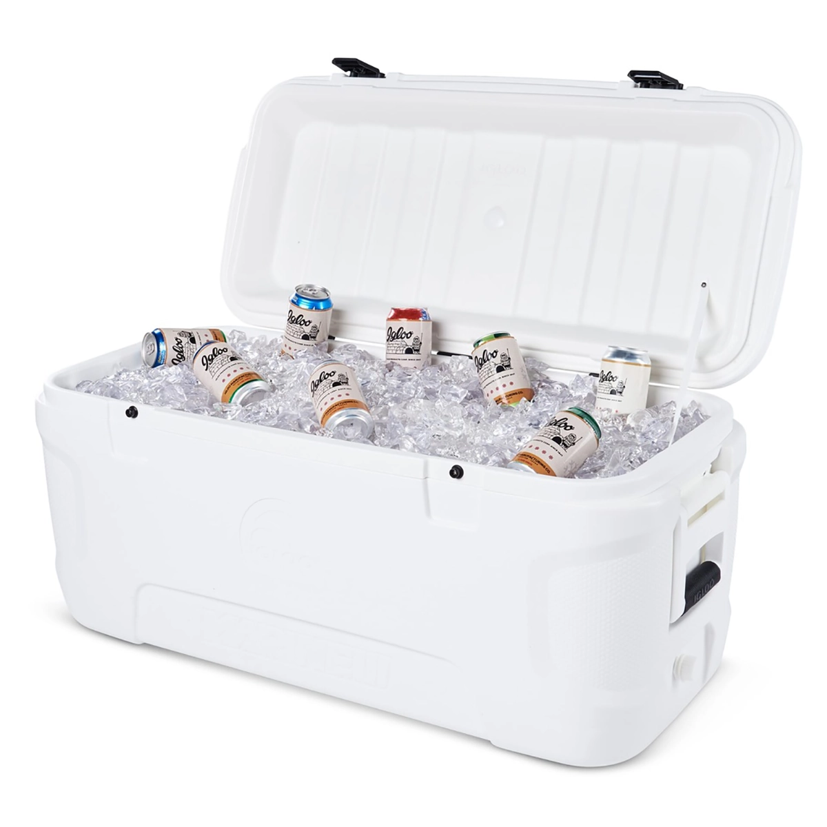 The Igloo Marine Contour 120 Quart Cooler Box – White is a high-capacity, durable cooler designed for marine and outdoor use. With a 120-quart (113-liter) capacity, it can hold up to 188 cans, making it ideal for extended trips, large gatherings, or commercial use.