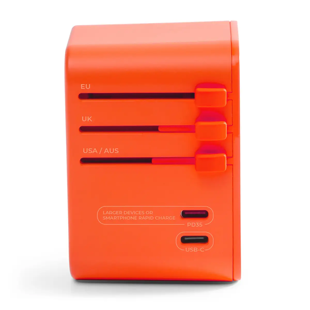 The Matador Global Travel Adapter – Forget-Me-Not Orange is a vibrant, compact, and versatile charging solution designed for international travelers.