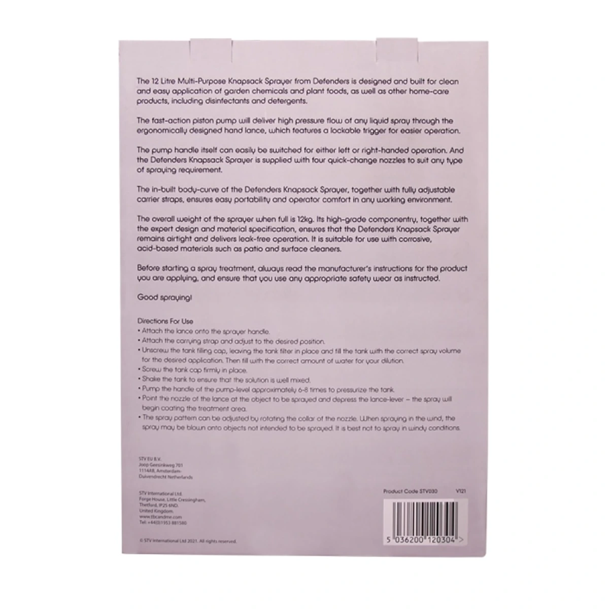 The STV030 Multi-Purpose Knapsack Pressure Sprayer – 12L by Defenders is a versatile and durable solution designed for the efficient application of various liquids, including garden chemicals, plant foods, disinfectants, and detergents. Its ergonomic design and high-performance features make it suitable for both domestic and professional use.