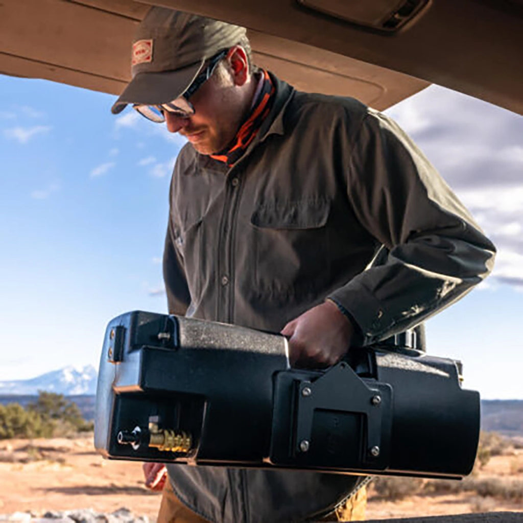 The WaterPORT Day Tank Trailer Hitch Mount (WX1101) from Nomadic Supply Company® securely attaches the WaterPORT Day Tank 3.85-Gallon Pressurized Water Tank (SC1000) to any standard trailer hitch receiver. This mount includes a 2″ hitch bar, a universal mount plate, and all necessary hardware for easy installation.
