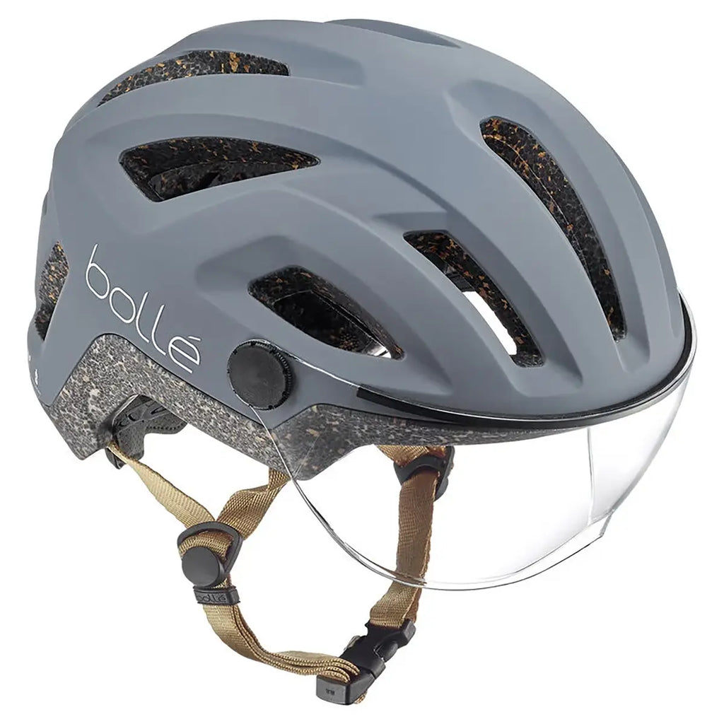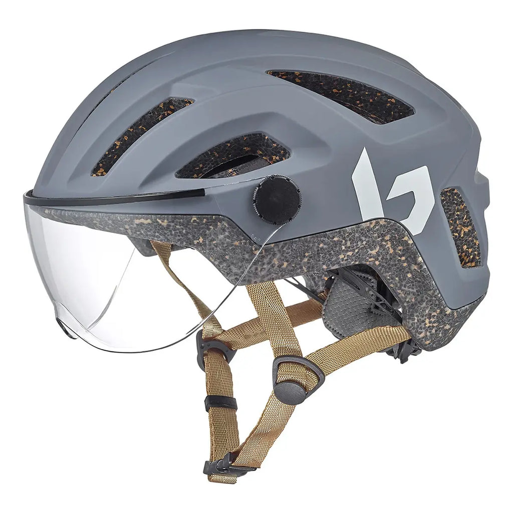 The ECO REACT VISOR is an urban commuter helmet that seamlessly combines stylish design, sustainability, and integrated eye protection thanks to its clear built-in visor (Cat 0)—perfect for cycling in low-light conditions with minimal tint. Built using AViD Aero Progressive EPS foam, which absorbs impact effectively while promoting airflow. Includes 20% cork mixed into the EPS, enhancing both cushioning and eco-performance. 100% recycled nylon plastic components, including the adjustment system. Uses 100% recycled fiber for straps and inner lining.
