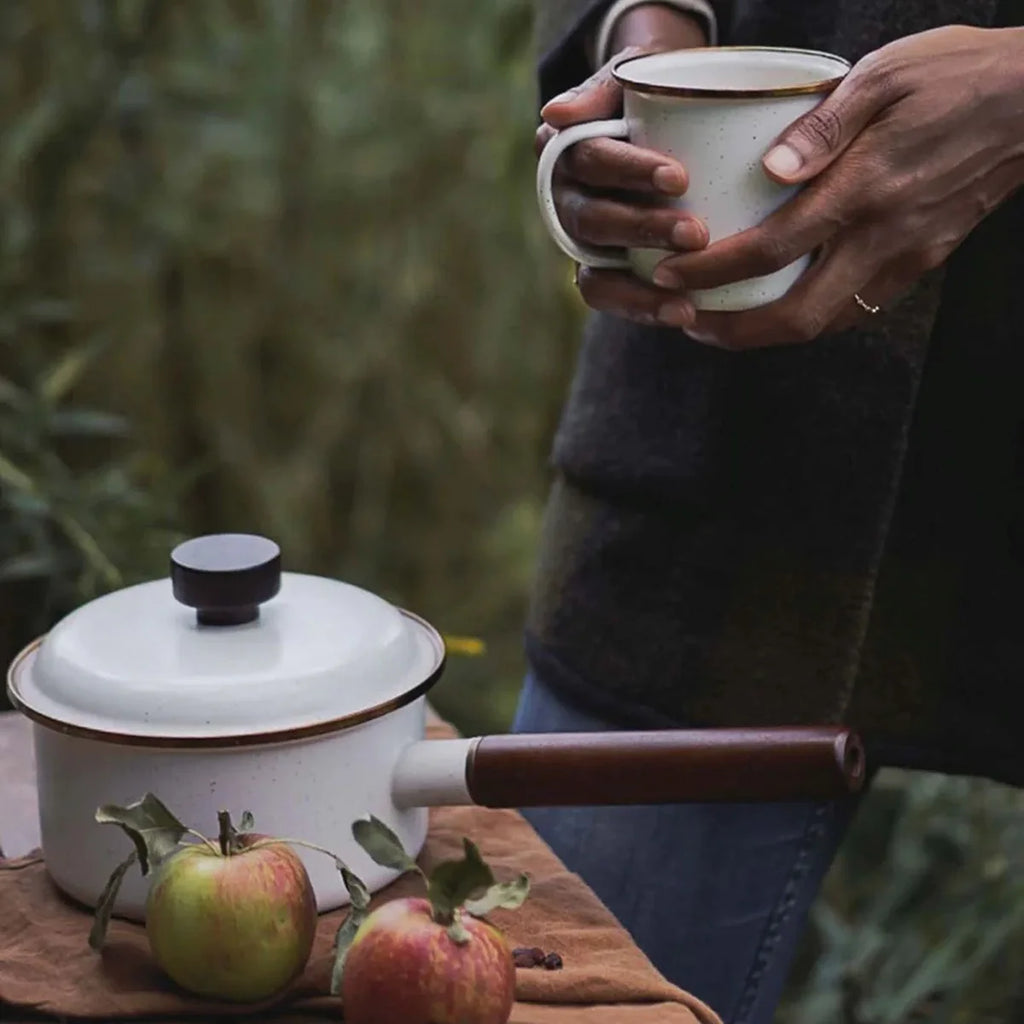 The Barebones Enamel Saucepan in Eggshell is a versatile and stylish piece of cookware, perfect for both indoor kitchens and outdoor cooking adventures. This saucepan features a vintage-inspired design with a creamy white Eggshell color and speckled enamel finish. Its hand-finished, baked stainless steel rim develops a bronze-like patina, adding rustic charm to your cooking setup. The long FSC-certified natural walnut handle and steep pan sides provide safety and control when handling hot liquids, making it suitable for simmering sauces, soups, and more.