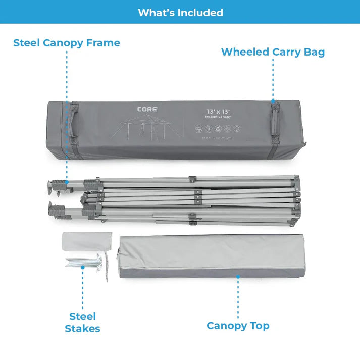 WHAT’S IN THE BAG: Includes frame, canopy with attached guylines, stakes, and wheeled carry bag.