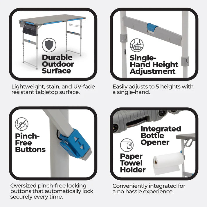 WHAT'S INCLUDED: A swiveling paper towel holder on the leg, an integrated bottle opener, a lantern holder, (4) hooks for hanging accessories, (2) cup holders, and an accessory bag.