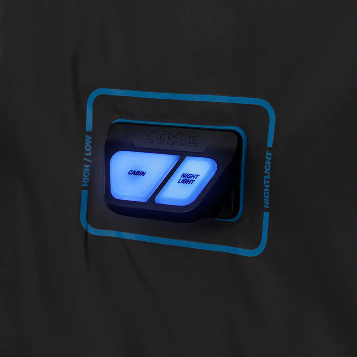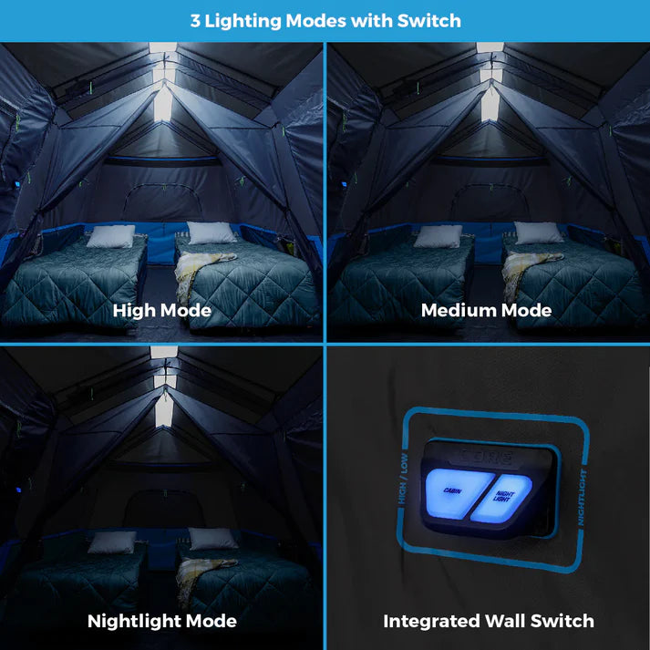 WHAT’S IN THE BAG: Includes tent with pre-attached poles, rainfly with attached guylines, room divider, battery compartment (4D batteries not included), tent stakes, and carry bag.