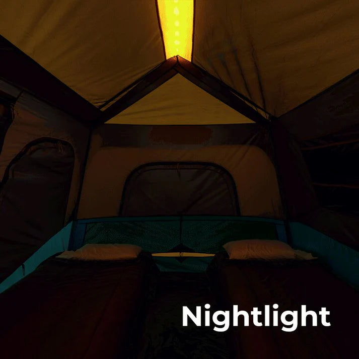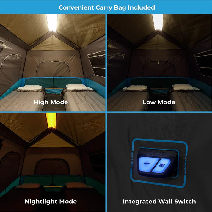 WHAT’S IN THE BAG: Includes tent with pre-attached poles, rainfly with attached guylines, wall organizer, gear loft, battery compartment (4D batteries not included), tent stakes, and carry bag.