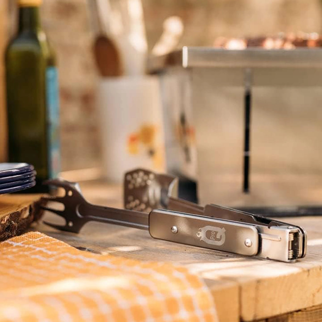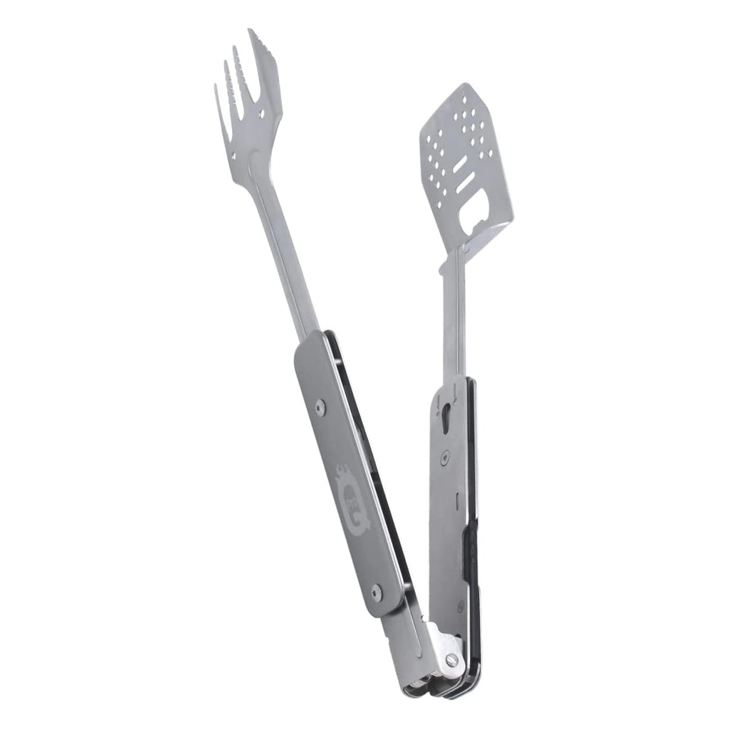 • 4-in-1 Functionality: Transforms into BBQ tongs, a spatula, a grill fork, and a bottle opener with a simple click and twist mechanism.